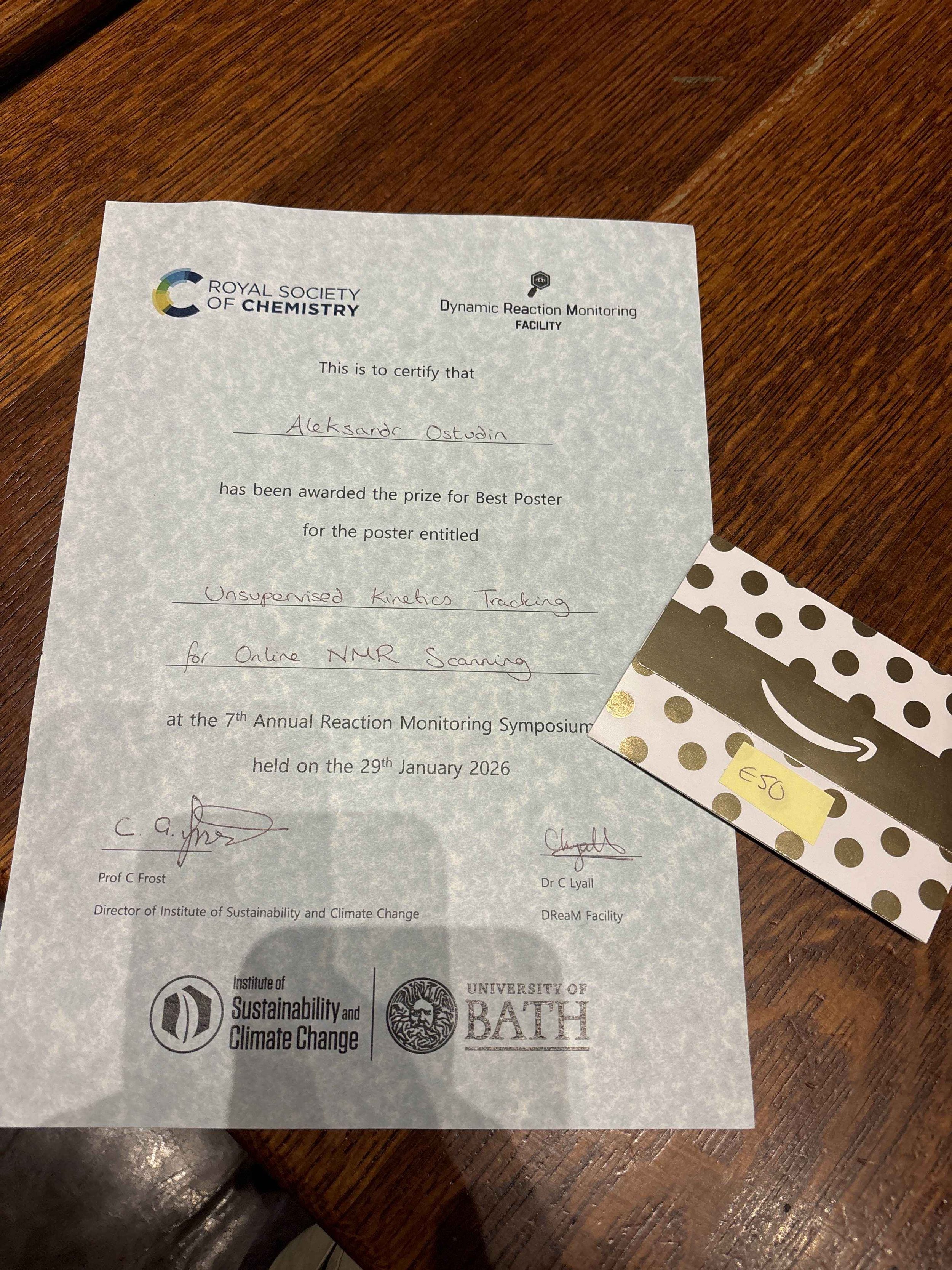January 2026: Massive congratulations to Alex who was awarded the best poster prize at the DReaM Facility Reaction Monitoring Symposium at Bath! Well done!
